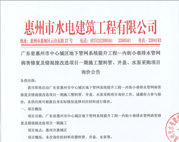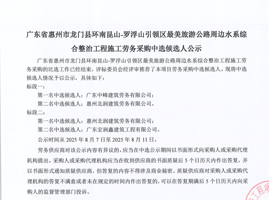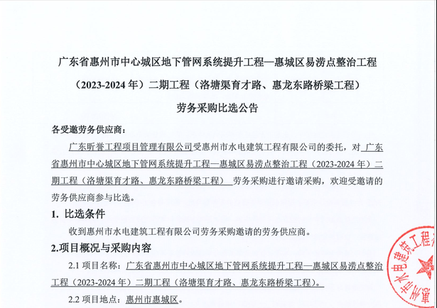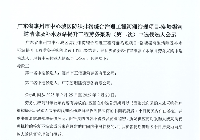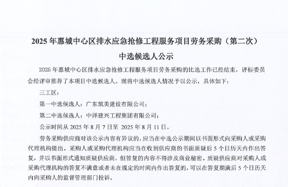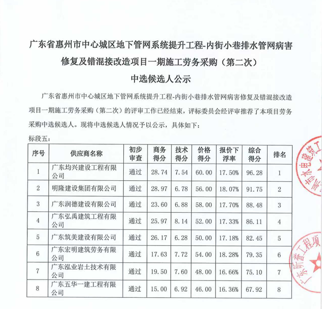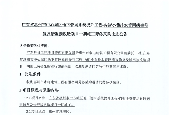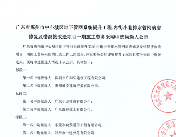 廣東省惠州市中心城區(qū)地下管網系統(tǒng)提升工程-內街小巷排水管網病害修復及錯混接改造項目一期施工勞務采購(第二次)中選候選人公示……